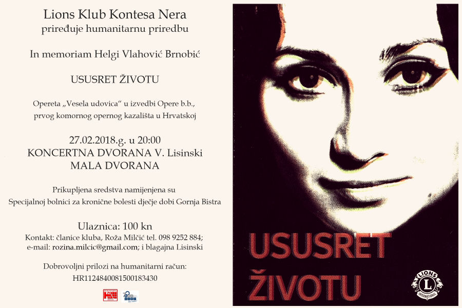 U organizaciji LIONS KLUBA KONTESA NERA održana je humanitarna priredba operete Vesela udovica u izvedbi prvog komornog opernog kazališta u Hrvatskoj – Opera b.b.